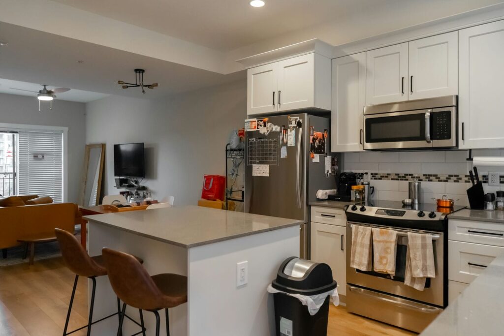- Refinished cabinets in kitchen and bathrooms to a white dove color with flat matte black handles