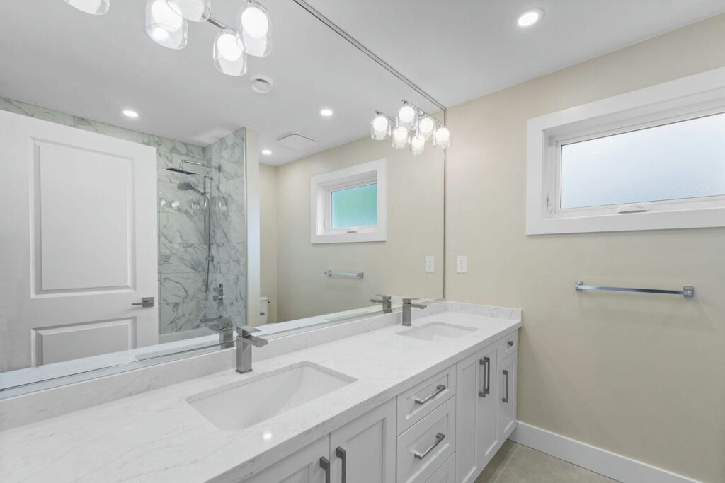 - Main bathroom features dual sinks, a large vanity, and a tub with a marble-like surround