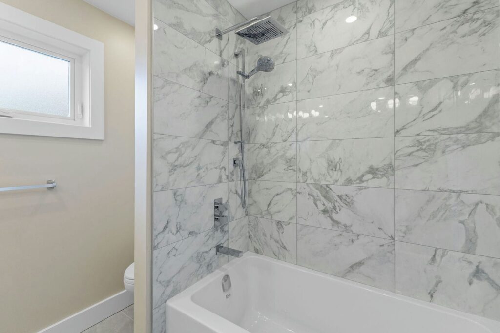 - Chrome plumbing fixtures and hardware add a polished, upscale touch