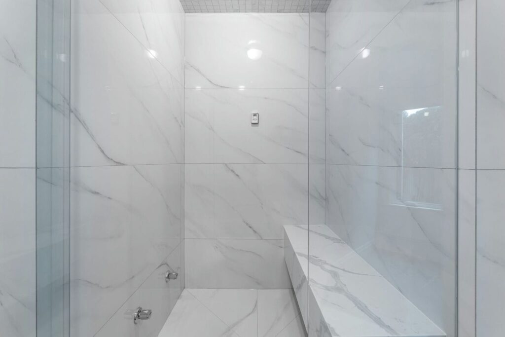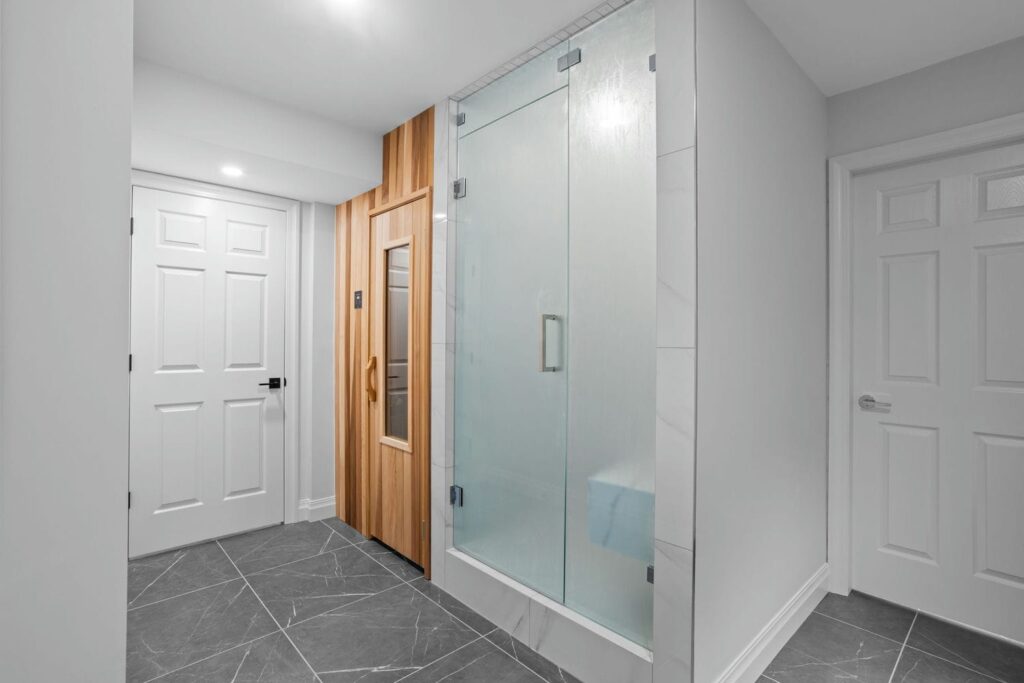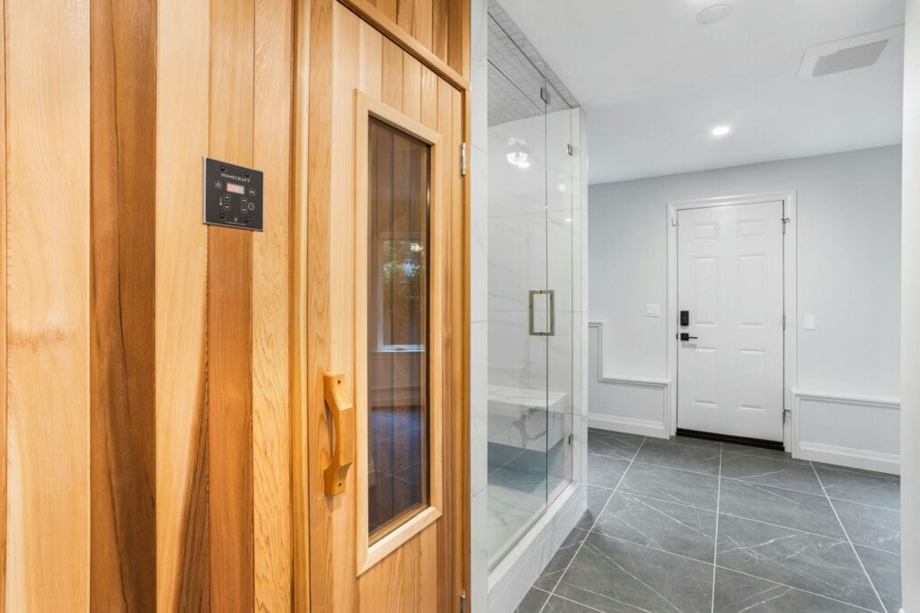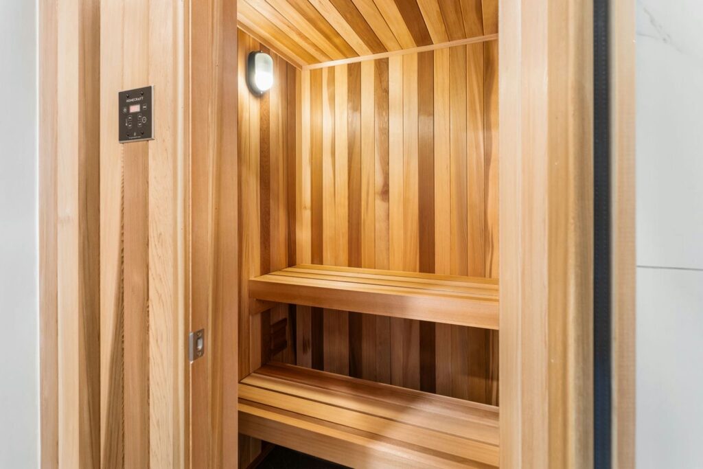 This luxury in-home spa includes a sauna and a customized steam room creating a haven of relaxation and rejuvenation. Careful consideration was given to every aspect of the design, ensuring that the ambiance is serene and inviting. From selecting soothing color schemes to incorporating natural elements of clear, grade A+ red cedar sourced locally, each decision is made with the goal of fostering tranquility and comfort.