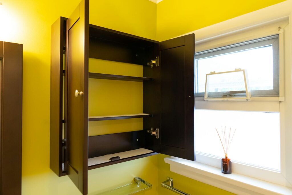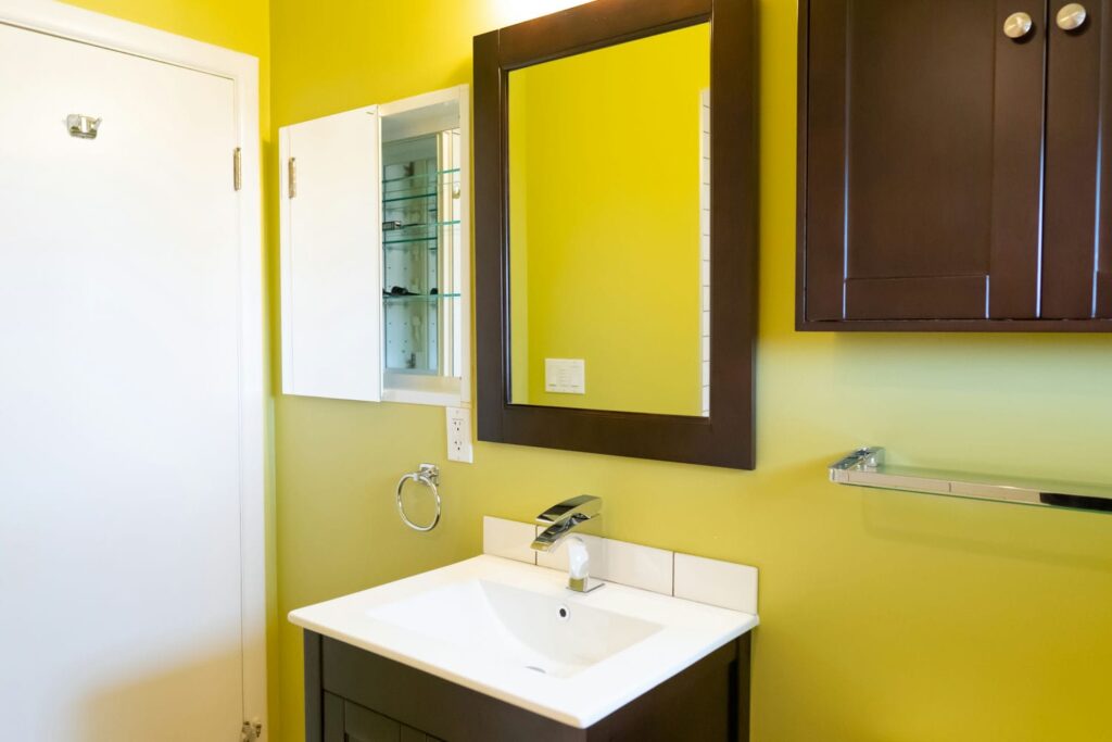 - Espresso vanity mirror with matching vanity and medicine cabinet above toilet