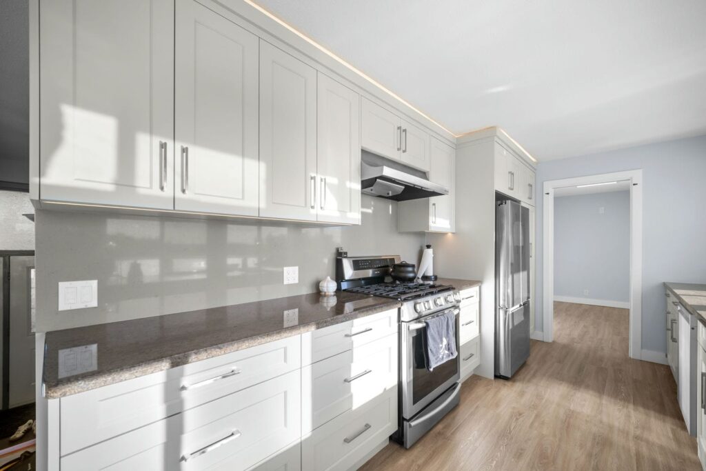 A beautifully refreshed kitchen renovation into a modern, functional, and personalized space. The renovation included a full shaker-style cabinet replacement with satin nickel hardware, a sleek quartz backsplash, LED accent lighting, drywall repairs, and a fresh coat of paint to unify the design. The pantry was thoughtfully reconfigured, creating dedicated space for the client’s pet snake enclosure. Every step of the project prioritized careful site protection, daily cleanup, and smooth project management, resulting in a stress-free experience and a kitchen the client loves.personalized kitchen.