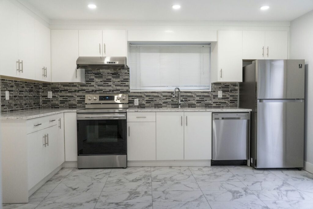 - 12’’ by 24’’ matte porcelain tiles in kitchen