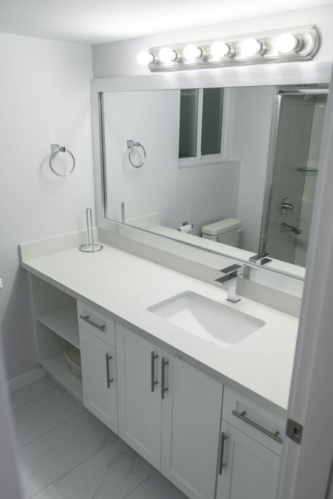 - Custom kitchen cabinetry and quartz countertops